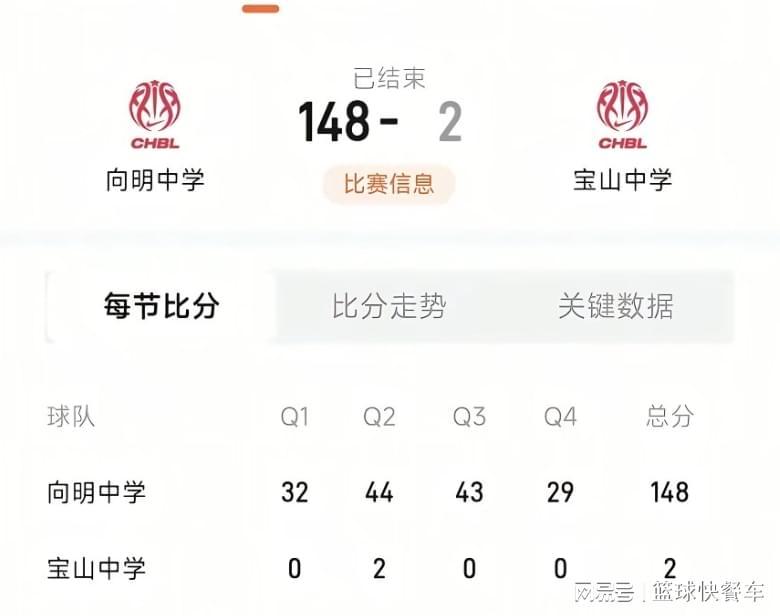148比2狂胜146分,这绝对是中国篮坛历史上最夸张的比分。2026年耐高联赛惊现夸张比分与分差,向明中学以148-2狂胜宝山中学146分。后者除了在第二节单节拿到2分外,其余三节比赛得分都被封0。全场比赛向明中学11人登场全部有得分进账,而宝山中学则9人登场8人贡献0分,在助攻数上,前者更是以33-0完成后者,可以说,这边是一场单边屠杀的比赛,毫无观赏性可言。